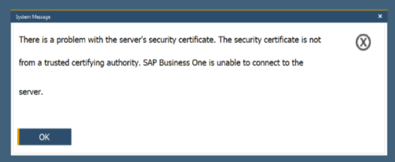 There is a problem with the server's security certificate. The security certificate is not from a trusted certifying authority. SAP Business One is unable to connect to the server.